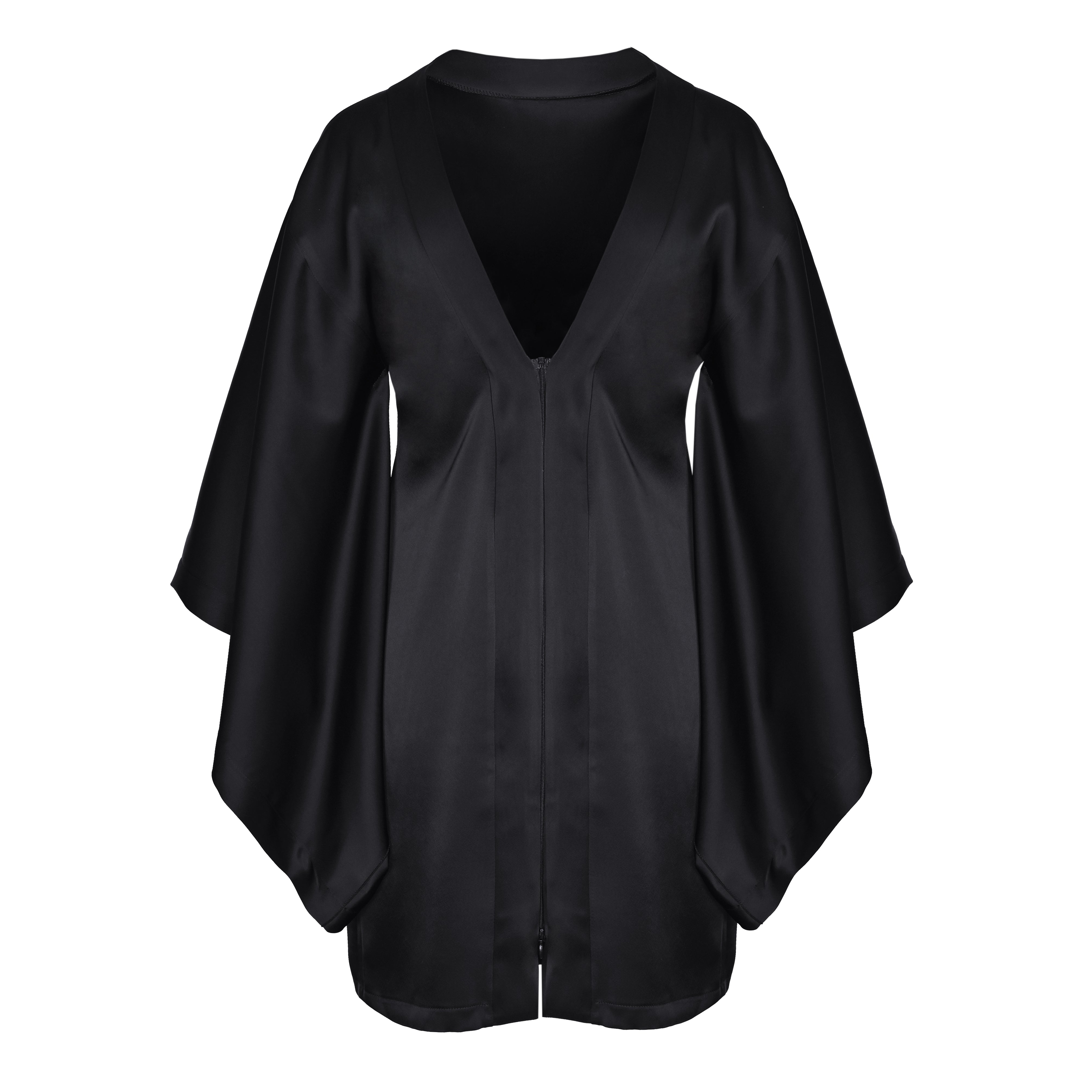 Wide sculptural sleeves echo the silhouette of an inverted kimono, creating a refined balance between structure and fluidity.